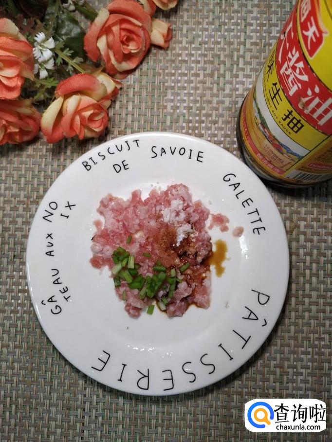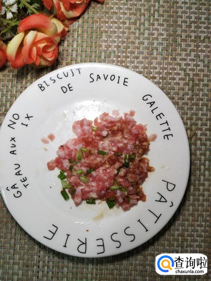 将五花肉洗净后切碎,再准备适量小葱切碎,五花肉放在一起,加入适量盐,鸡精,五香粉,生抽,料酒,淀粉,搅拌均匀,腌10分钟左右。
