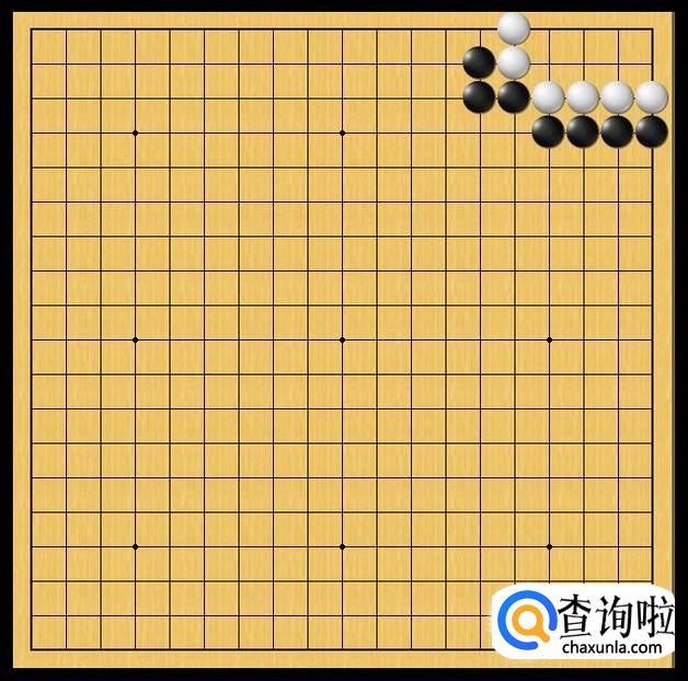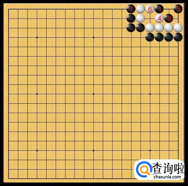 黑棋不敢粘上黑1,一旦粘上黑1,那白棋内部的黑子都会被白棋打吃掉。于是,黑棋在外围黑7处挡。黑7的挡彻底的把白棋的外气紧来没有了,而且还叫吃白棋底边左面的白三子。如图所示。