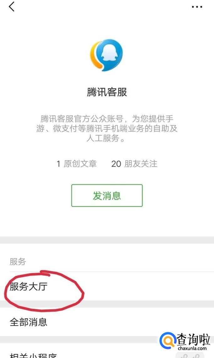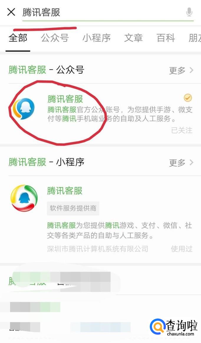 被骗后不要慌张,首先准备好被骗的截图,然后打开微信在搜索栏输入腾讯客服并关注,如下图。