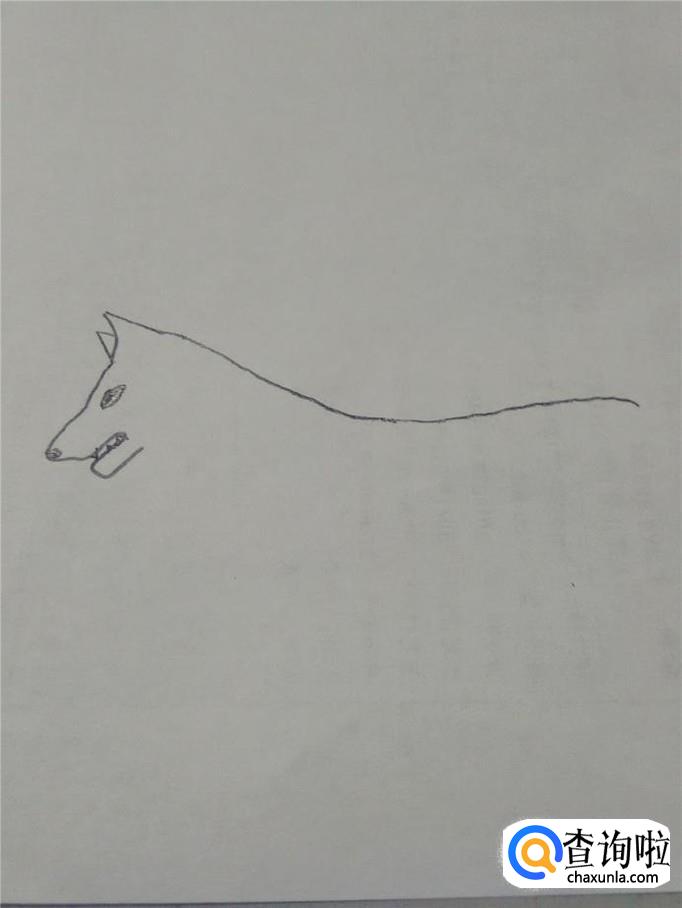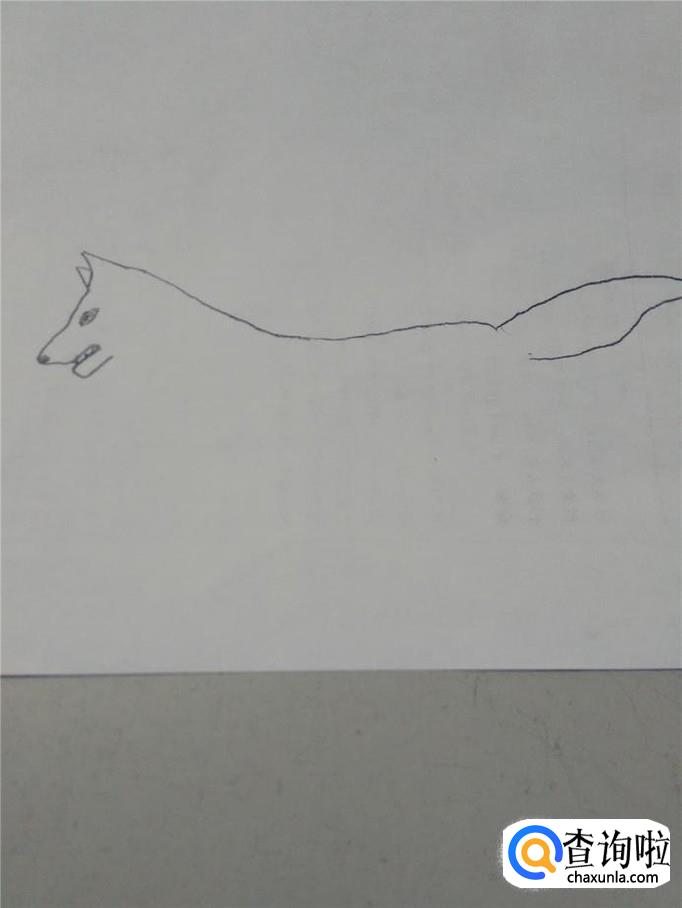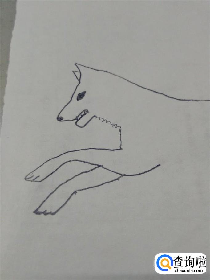从肚子往右,再画两条后腿,腿根处要画得粗粗的,小腿要画细些,腿的末端也画两条小细道,表示爪子。狼的轮廓就画完了。
