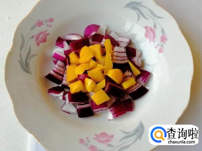 把切好的紫圆葱放入盘中,加入切好的黄色彩椒丁,再加入红色的彩椒丁,都摆好待用。