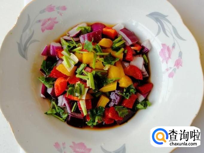 适量紫圆葱,适量彩椒,适量香菜,适量葱,适量食盐、适量生抽,适量香醋,适量味精