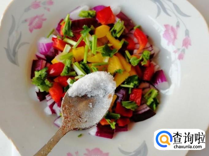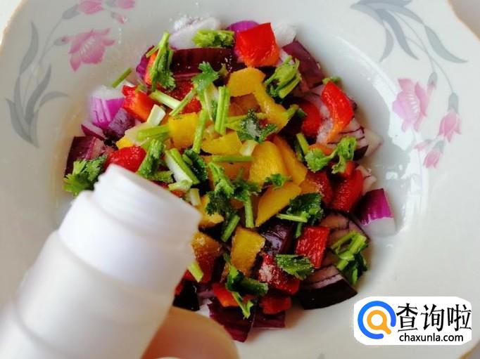 撒上备好的香菜末和青菜末,加入适量食盐,先把紫圆葱和彩椒用盐腌一会,最后加入食醋。