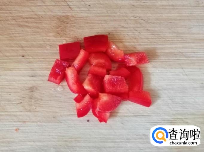 取一个红色的彩椒,用清水把红彩椒洗净,同样用刀去掉彩椒把和籽,把红菜椒放在菜板上,用刀把红彩椒切丁待用。