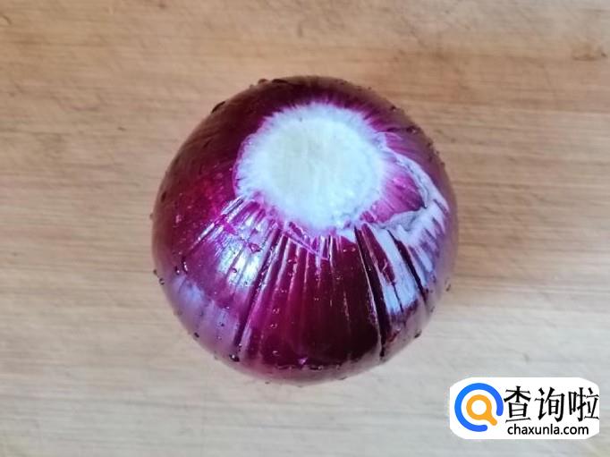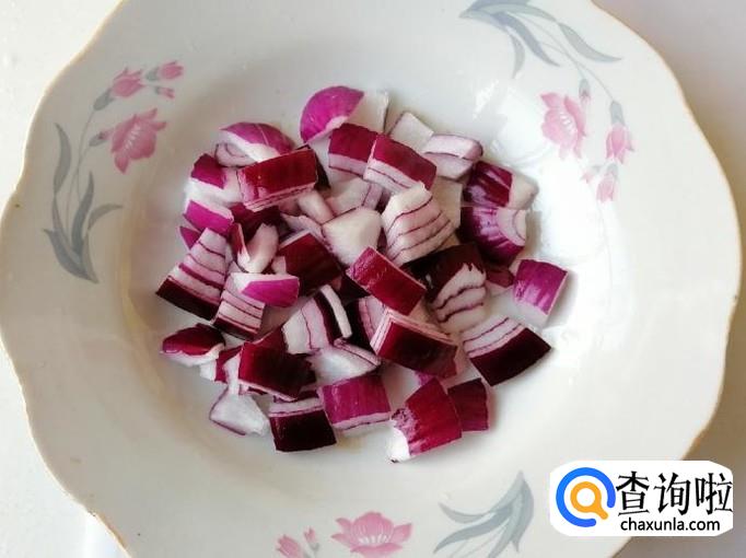 取一个新鲜的紫圆葱,先把紫圆葱扒皮、取头尾,然后用清水把紫圆葱洗净,最后把紫圆葱切丁待用。
