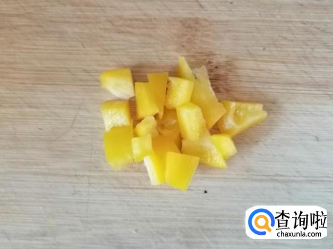 取一个黄色的彩椒,用清水把黄彩椒洗净,然后用刀去掉彩椒把和籽,把彩椒放在菜板上,用刀切成彩椒丁待用。