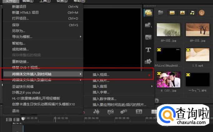 点击页面上方的“文件”,再点击“媒体文件插入时间轴”,将光标移动到“插入视频”。