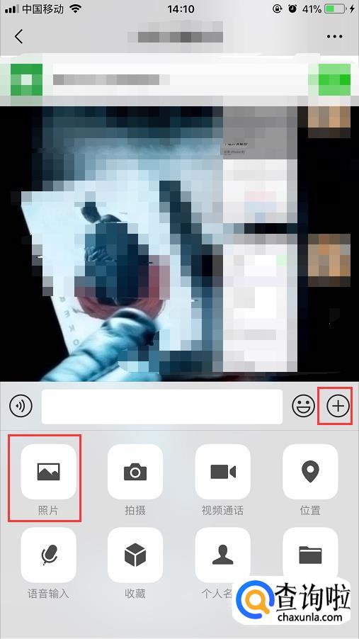 然后找到你想要分享的好友或者群,点击右下角的“⊕”符号,选择【照片】;