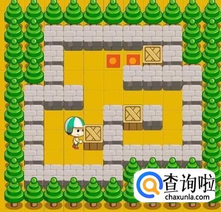 先将脚下的箱子向左挪一步,再将第二排的箱子向下推至与第三排箱子并排,然后将最上的箱子推至第一枚钱币,再将并排的箱子的右手箱子直接顶回到第二枚钱币,最后按从下往上的顺序将最后的两箱推入相应的钱币即完成任务。