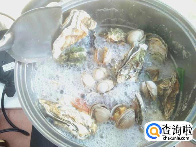 当煮开之后,就别盖着盖子煮了,打开锅盖煮五分钟,期间要翻一下,翻完之后再煮三分钟,海鲜基本上就熟了。很多人会告诉你,吃海鲜的时候不用使劲煮,这是不可以的,海鲜不煮熟吃起来口感好且嫩滑,但是里面含有大量细菌。
