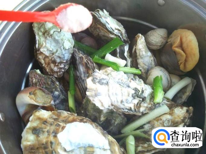 找个大一些的锅,先把牡蛎放进去,再把香螺放进去,最后放上白蚬子。因为我用了一个锅不太大,后来换了一个大点的锅,所以放海鲜的顺序有些不对,大家知道就行哈。然后切葱段和姜片放进去,再加上两三小勺食盐,盖上锅盖煮。