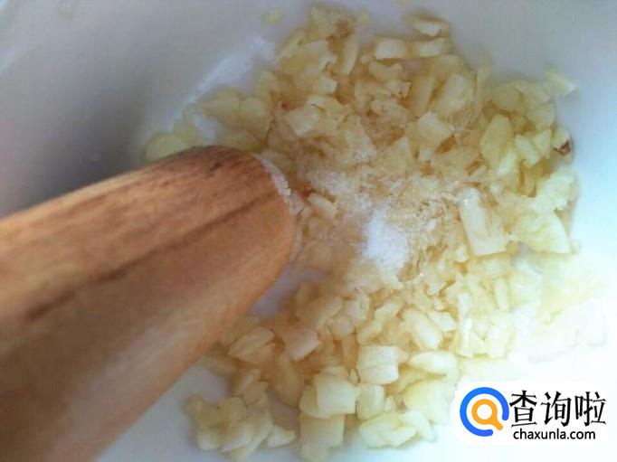 大蒜拍碎之后要捣成蒜泥,捣蒜泥的时候,往里面加点食盐和一点点味素,然后捣成蒜泥待用。