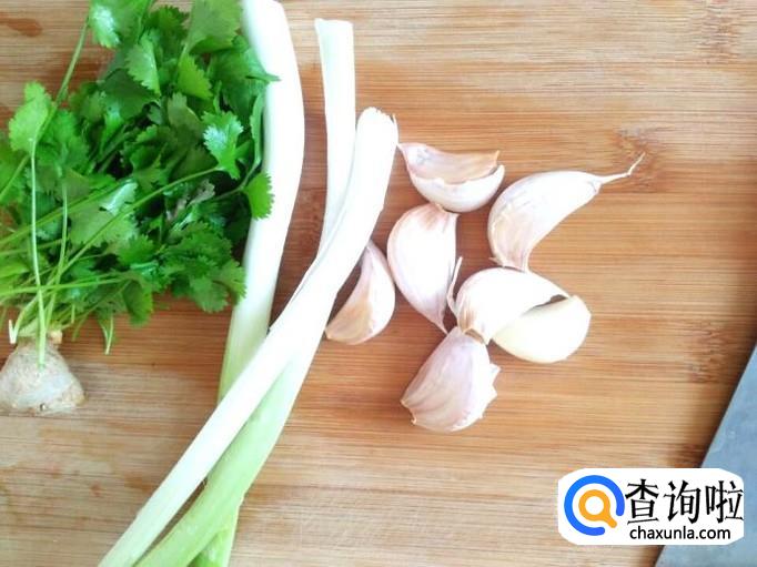 下面要做的,就是准备葱姜蒜了,小葱几根,大蒜几瓣,再准备一点生姜,吃海鲜是绝对离不开这三样的,然后准备几棵小香菜。