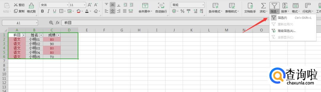 接着点击菜单栏右边的“筛选”添加表头筛选,如下图所示。
