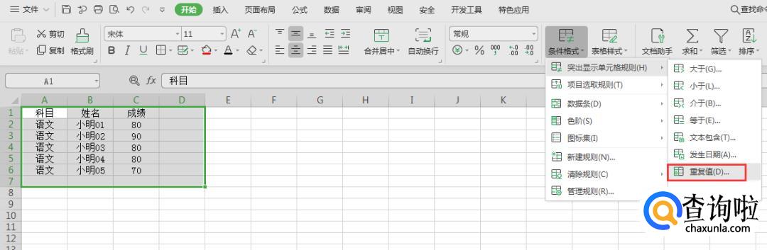 先选中需要查找重复内容的数据,然后依次点击“条件格式—突出显示单元格规则—重复值”,如下图所示。