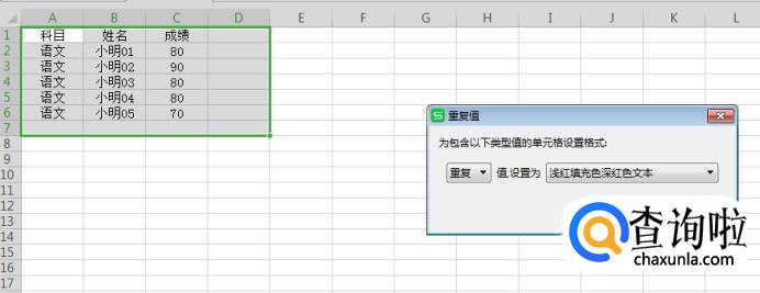 点击确认默认颜色后,在选中区域里重复的数据就会突出显示为粉红色。