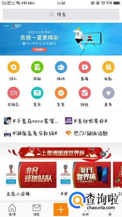 首先点开微博,再点击微博主页的下方的“发现”。