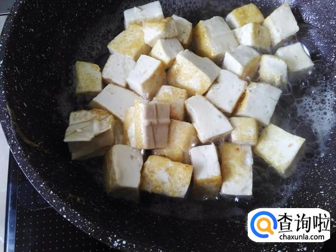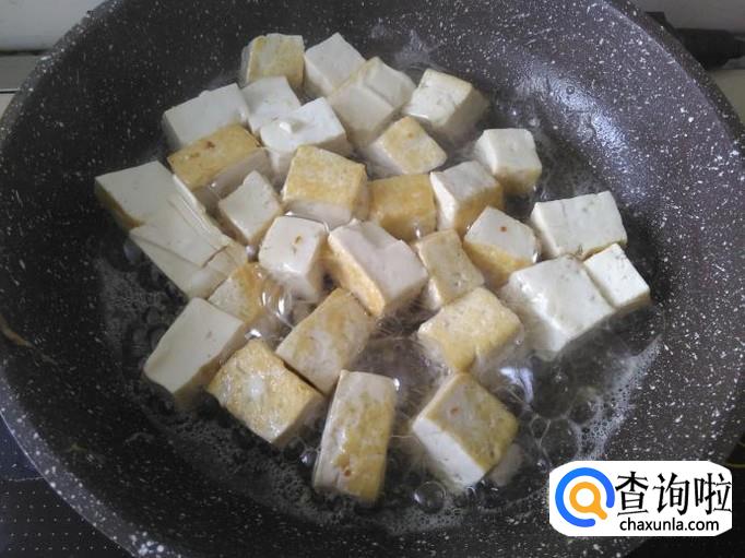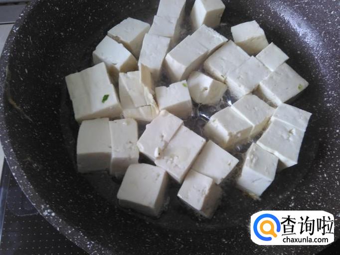 把豆腐放进锅里中火煎,一边煎一边摇动平底锅。