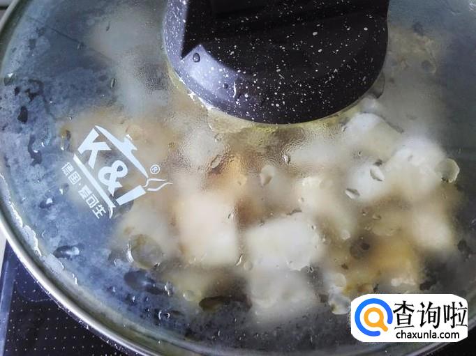 打开盖子加香葱白、1勺老抽、加调好的生粉糊。