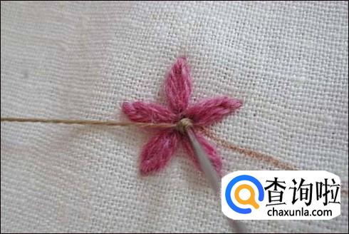 花瓣绣好后,接着用棕色的线绣花蕊,针尖穿过布后,用线围着针绕几圈,针直接拉出来把线都连在一起,形成花蕊。