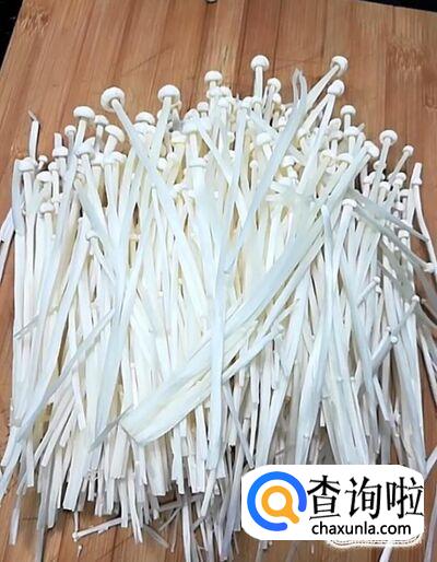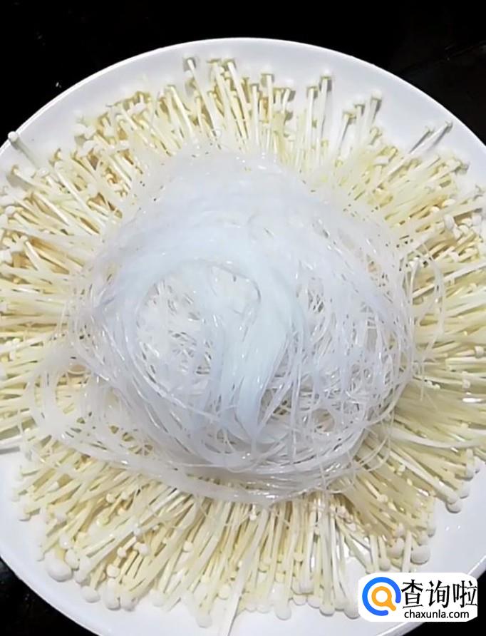 然后我们将金针菇摆入盘中,放上泡好的粉丝