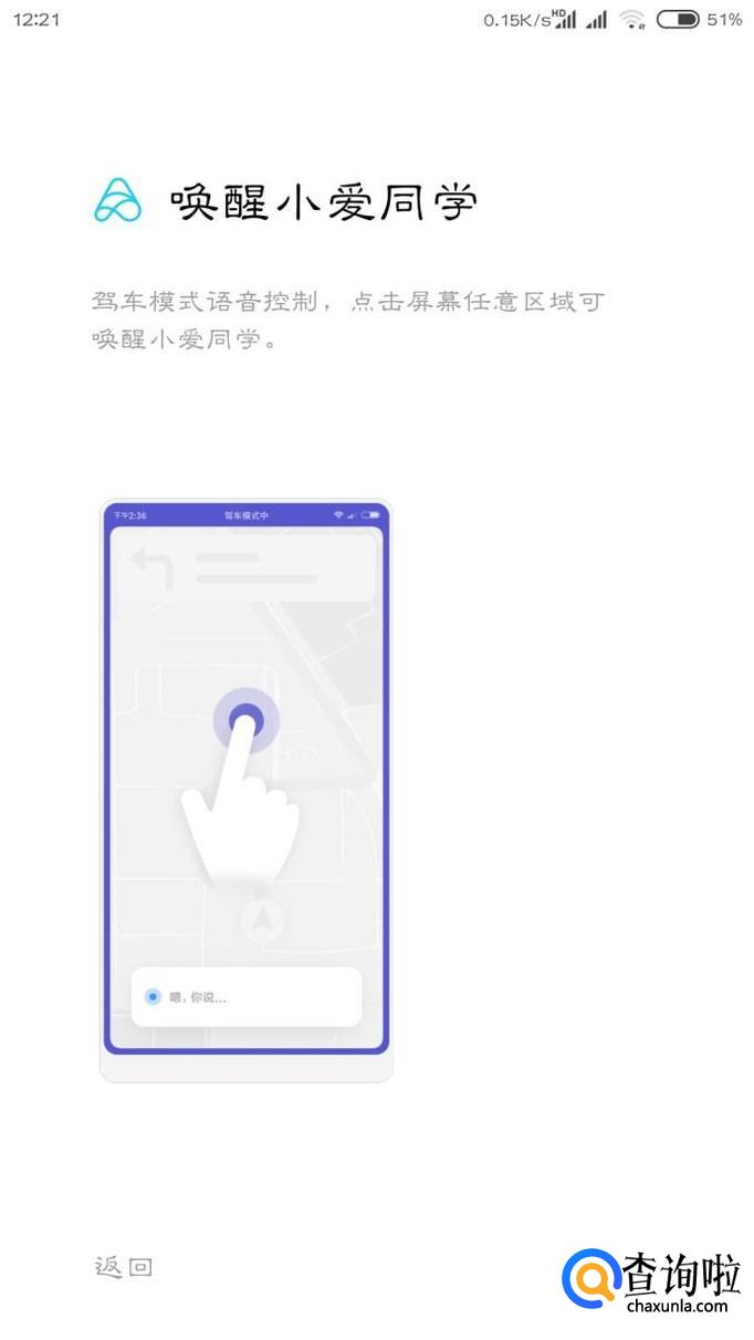 在驾车模式中,屏幕的边缘会变成一圈紫色,点击屏幕任何位置即可唤醒语音助手。