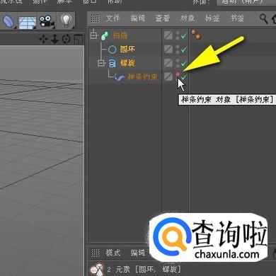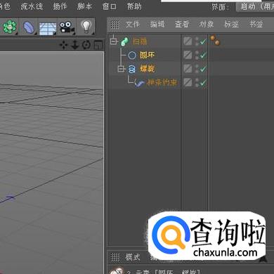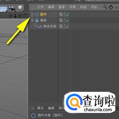 同时选中圆环对象与螺旋对象,并拉向扫描对象,当出现向下箭头时,再放开手,那么,圆环对象与螺旋对象成为扫描对象的子级。