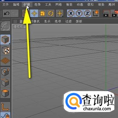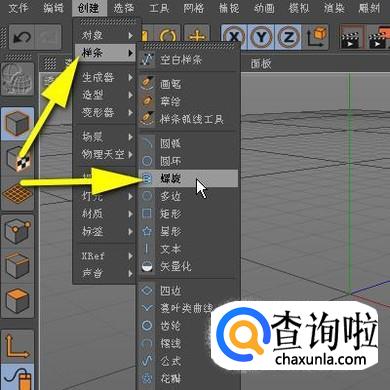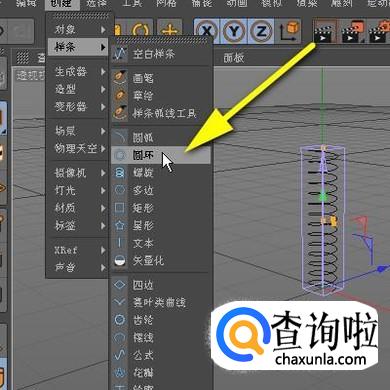 鼠标移到菜单栏中的“创建”菜单这里,点击一下,在弹出的菜单中,鼠标放在“样条”这里,在右侧弹出的子菜单中再点:圆环。新建圆环对象。