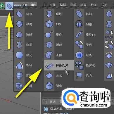 如图中所示,鼠标点击扭曲图标,在弹出的变形器面板中选择:样条约束;新建样条约束对象。