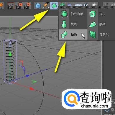 如下图所示,鼠标点住“细分曲面”图标,弹出生成器的面板,在其中点击“扫描”;新建扫描对象。