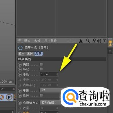 在下面即展开了圆环的属性面板,我们在其面板中,把半径参数修改为1CM。