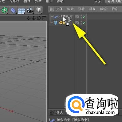 鼠标移回到对象面板这里,鼠标点住样条约束对象,拉到螺旋对象的下面,出现黑色向下箭头时再放开鼠标,那么,样条约束与螺旋样条就建立父子关系。