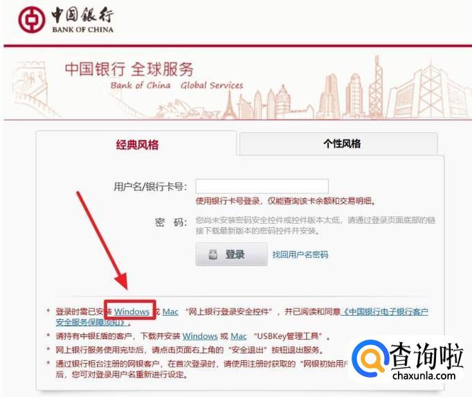 “登录时需已安装 Windows 或 Mac “网上银行登录安全控件”,并已阅读和同意《中国银行电子银行客户安全服务保障须知》。”