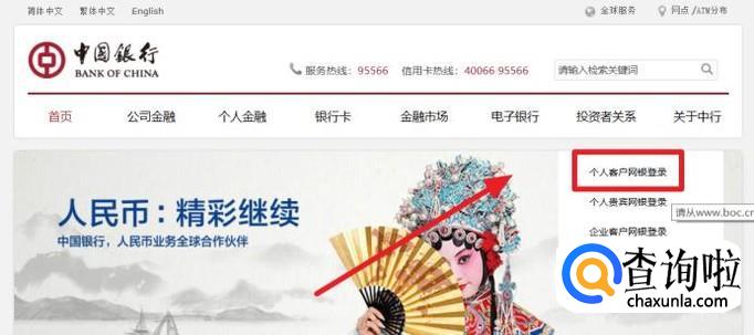 进入中国银行 官方网站后 单击右方的“个人用户网银登陆”。