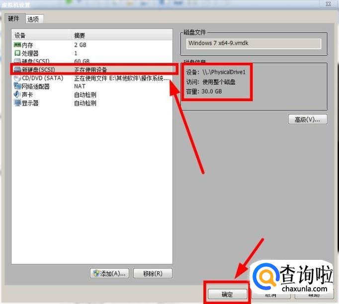 可以看到:成功显示出添加的新硬盘,包括设备信息和设备容量大小,点击“确定”
