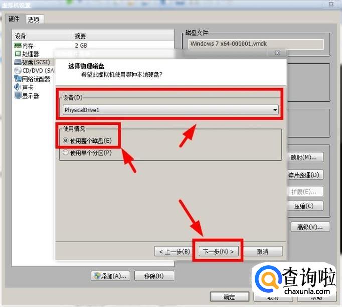 此时选择“physicalDrive 1”(未插入U盘或者运行虚拟机后再插入U盘的话是不会显示出此项的),在使用情况中选择“使用整个磁盘”,点击“下一步”