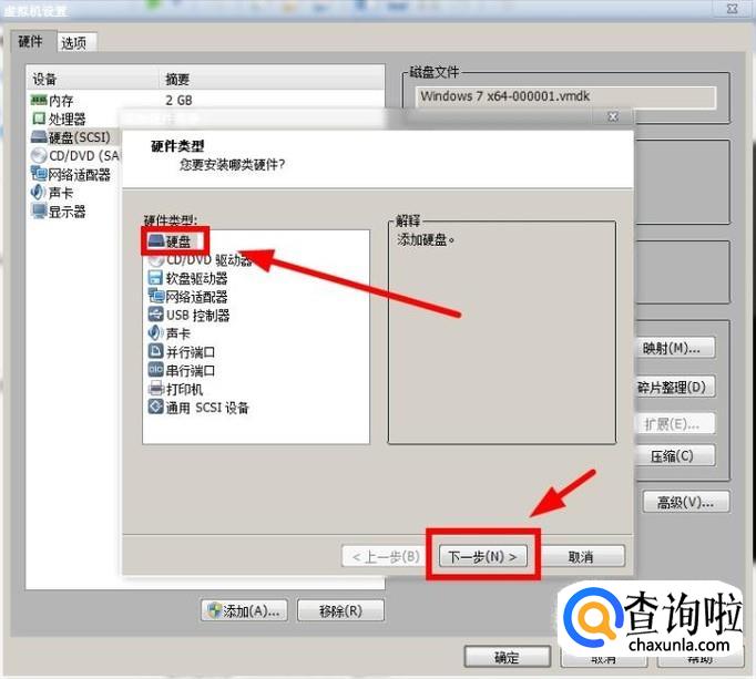 在硬件类型界面,选择“硬盘”,点击下一步