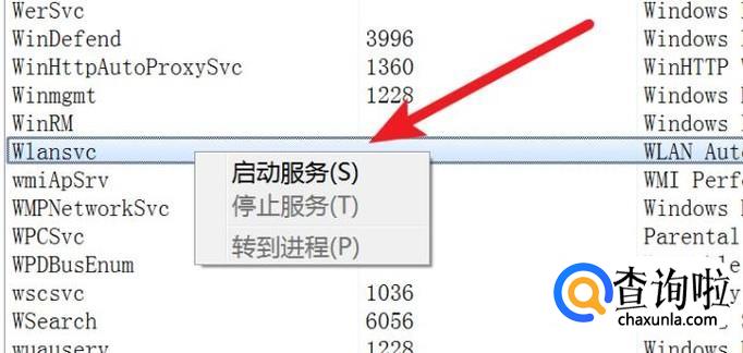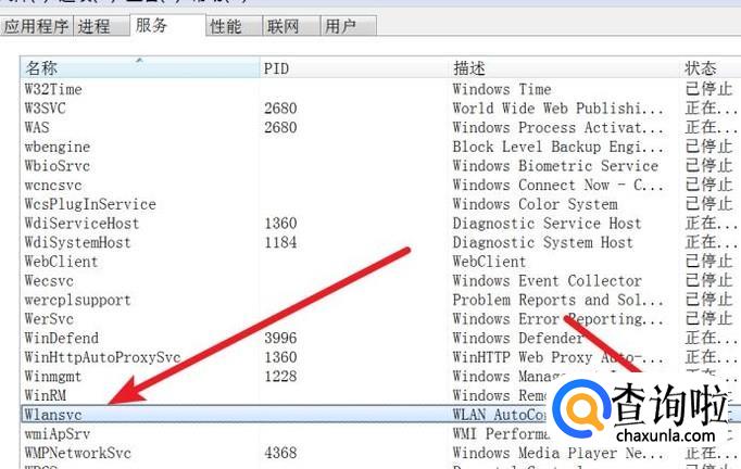 在这个服务列表里,找到‘Wlansvc’这个服务,可以看到右边状态栏下是‘已停止’状态的。
