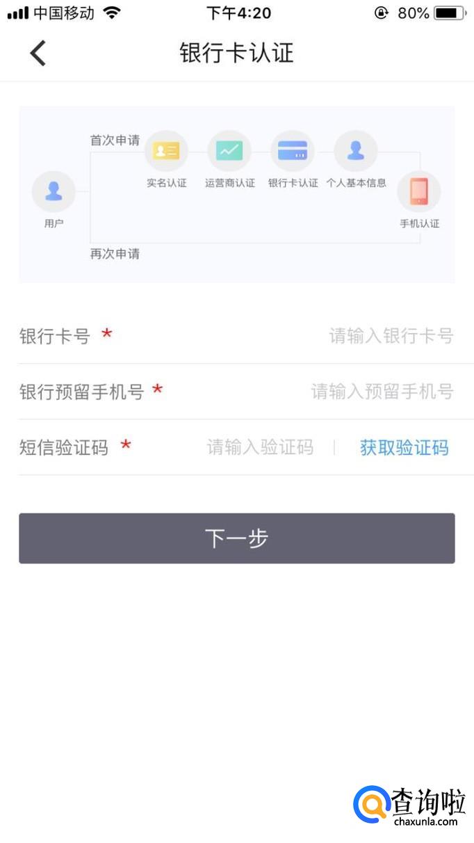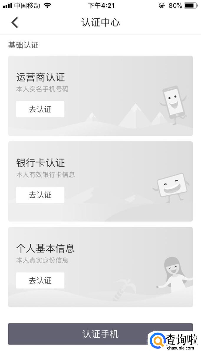 3.填写运营商认证,银行卡认证,个人基本信息。完成后点击“认证手机”即可进入审核。