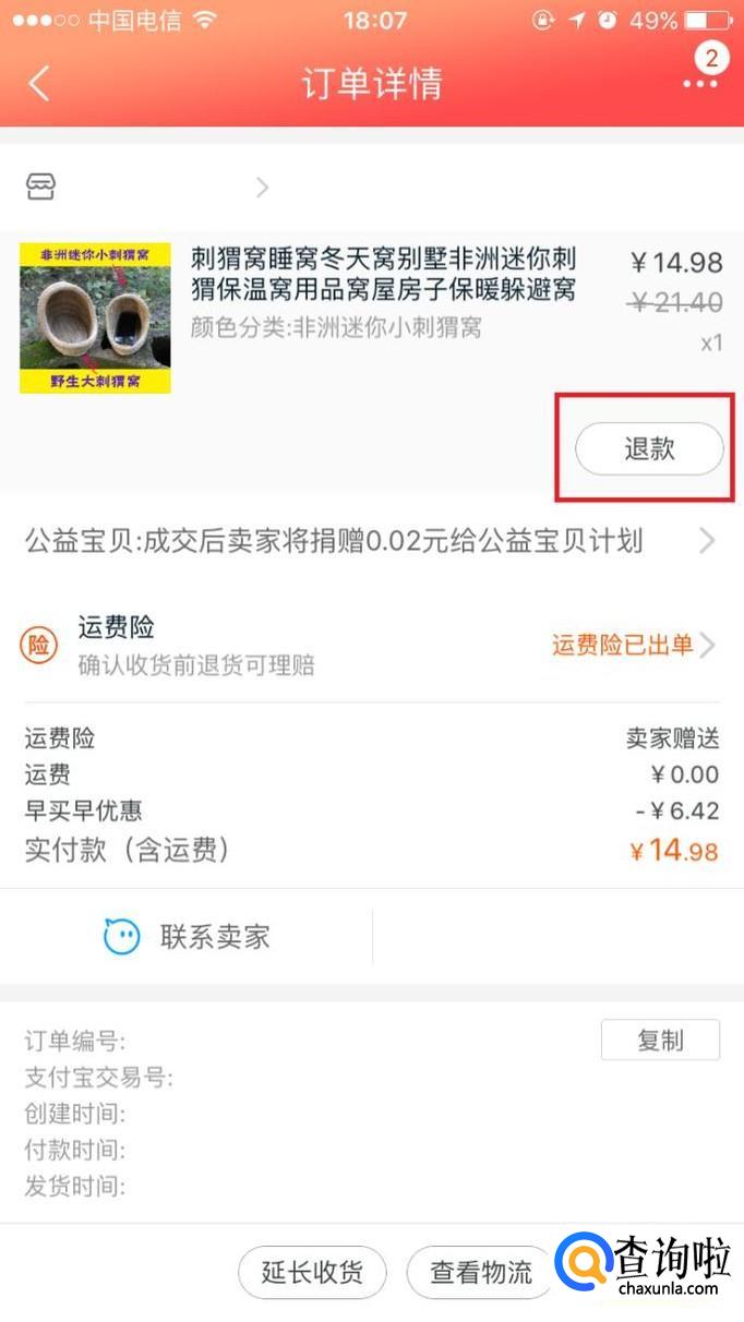卖家收到商品确认无误后同意退款,我们再进入商品详情页面,上面显示“退款成功”,点击“运费险已赔付”。