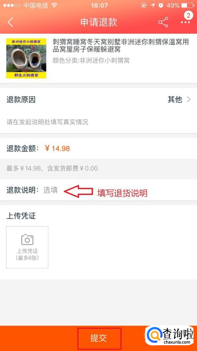卖家同意后,将商品寄回卖家给的地址,等待卖家收货,这时商品页面显示“退款中”。