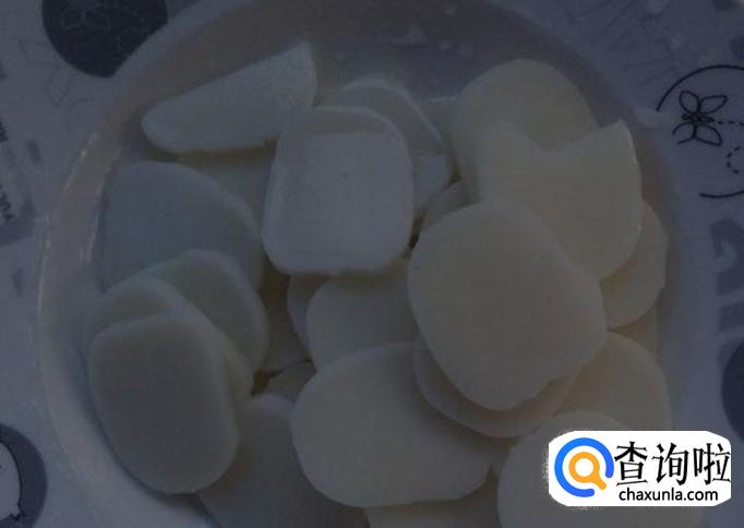 将年糕切成饱饱的小片,装盘备用