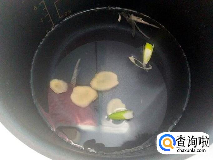 这道菜非常适合想吃美食,又懒得煎炒烹炸的人,比如我,哈哈。电饭煲里加上清水,清水的多少随你自己的便,想多喝汤就多加点,然后把葱姜放进去烧开。