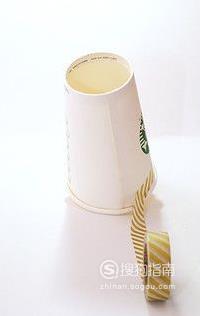 用装饰胶纸或者粘过胶水的花边条,装饰在纸杯的杯口或者整个杯身。
