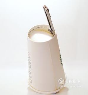 将改造过的一次性纸杯杯口朝下,盖在一个口径相仿的高脚酒杯上。