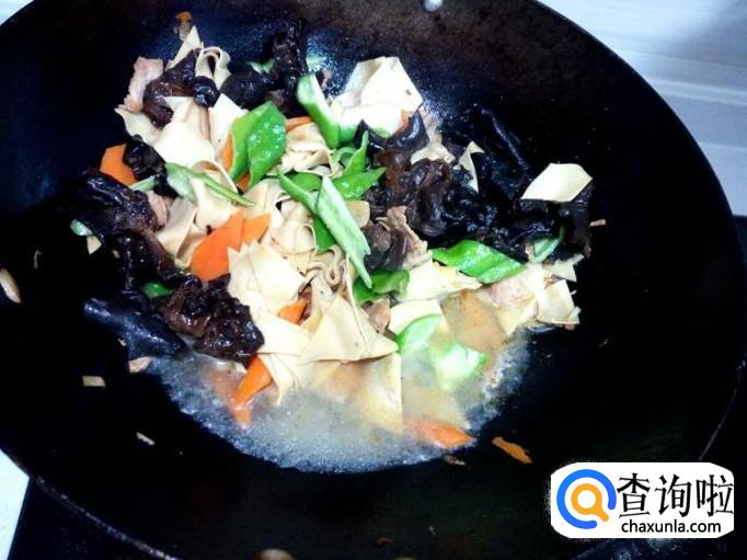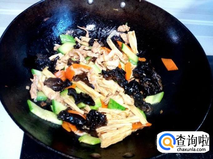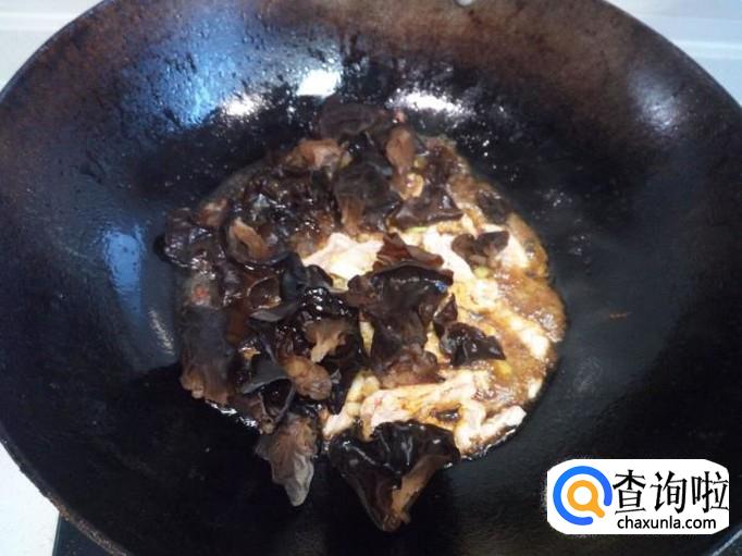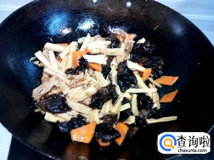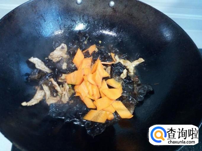 然后放入木耳翻炒,炒至木耳透亮,放入胡萝卜片翻炒至变软。