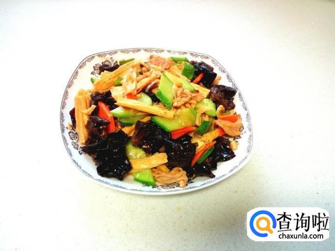 干腐竹 150克, 木耳 20克,黄瓜 (旱黄瓜)1根 ,胡萝卜 半根,猪肉 100克。