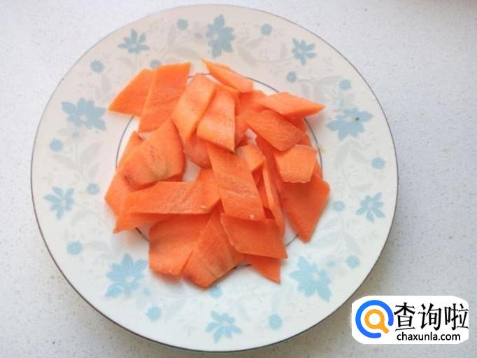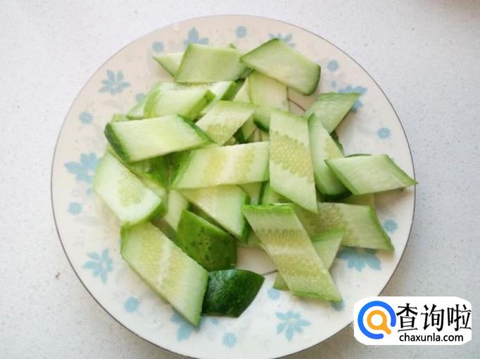 黄瓜用水清洗干净,控干水分,切成菱形片。胡萝卜去皮,用水清洗干净,切成菱形片。