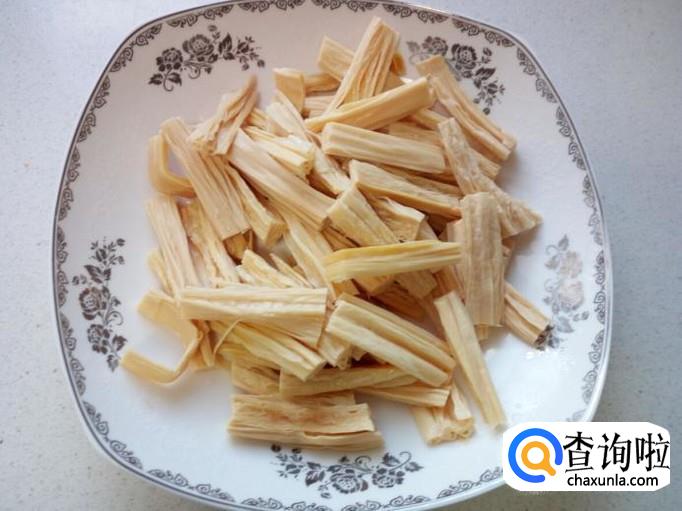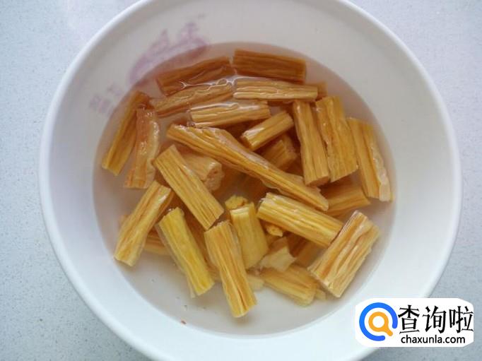 把干腐竹放入水中浸泡至变软(2~4小时)。然后把泡好的腐竹,用水清洗干净,控干水分,用刀在中间切成对半,装盘备用(我这干腐竹买回来,就是这种段形状的,如果长的,就要切成段)。