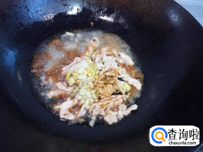 肉炒至颜色微白,放入葱,姜,蒜,翻炒,放入料酒,酱油。
